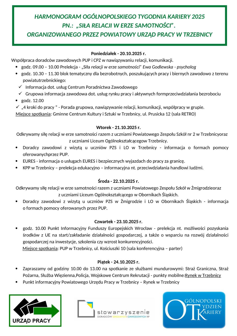 HARMONOGRAM OGÓLNOPOLSKIEGO TYGODNIA KARIERY 2025 PN.: „SIŁA RELACJI W ERZE SAMOTNOŚCI” ORGANIZOWANEGO PRZEZ POWIATOWY URZĄD PRACY W TRZEBNICY