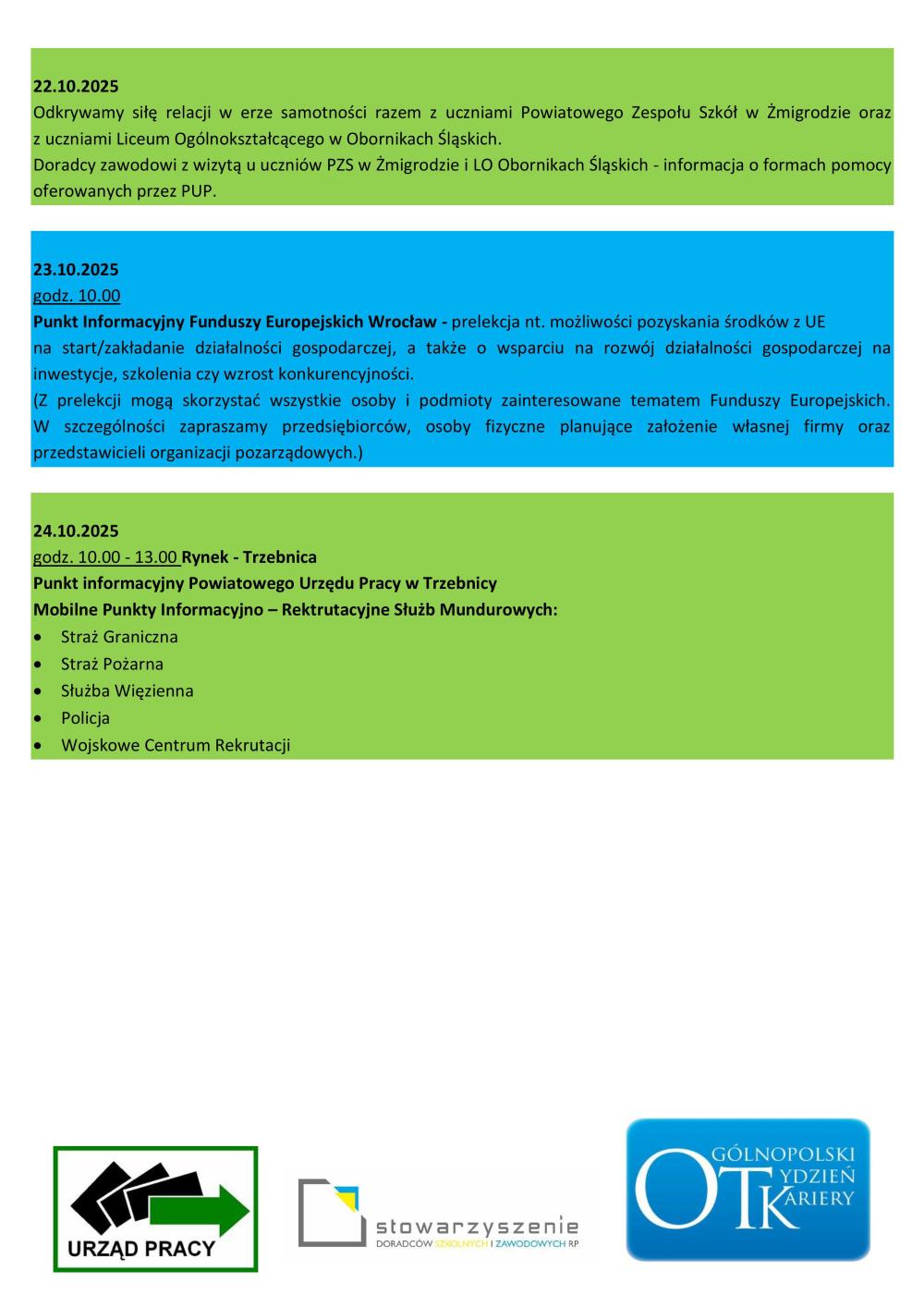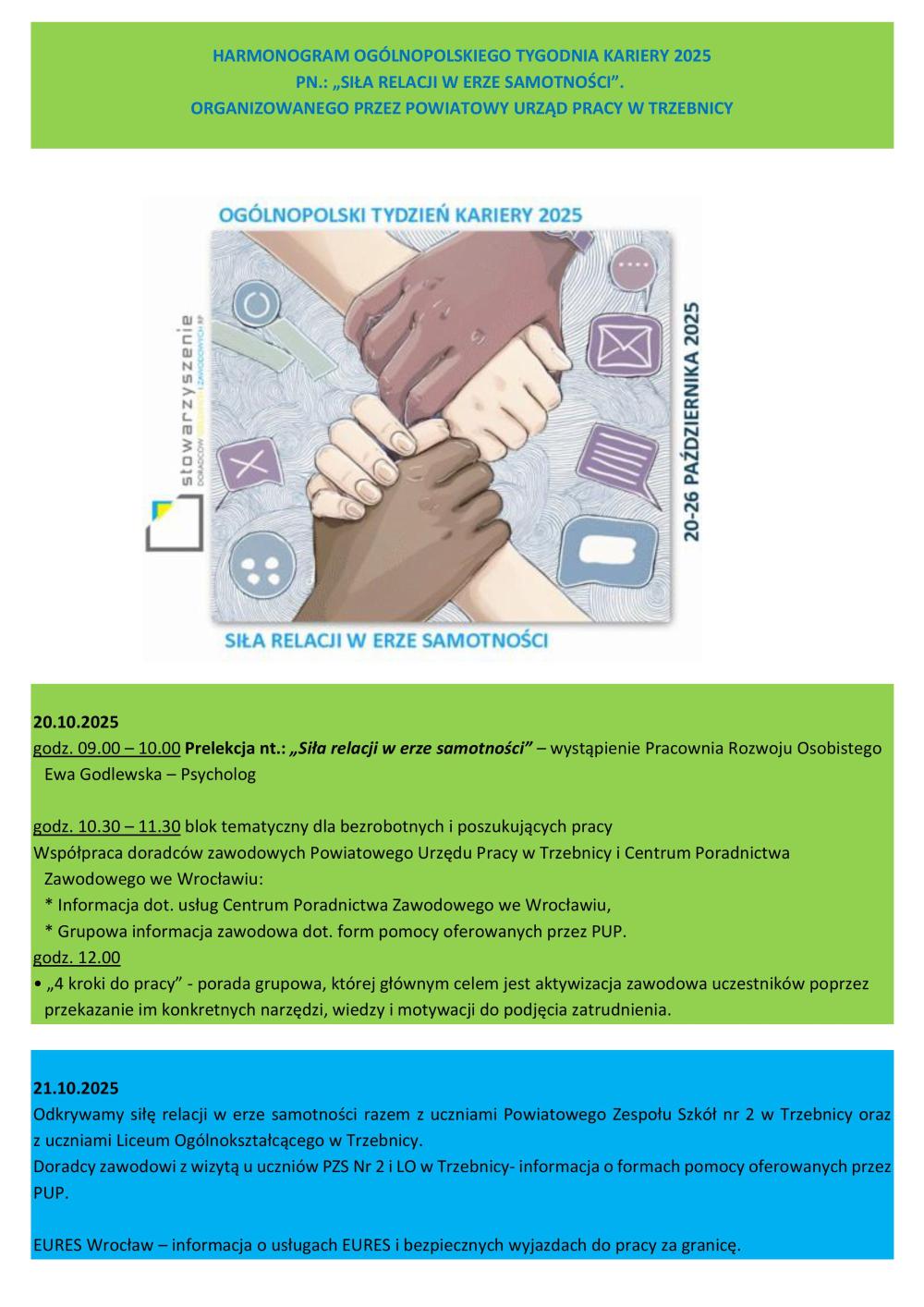 HARMONOGRAM OGÓLNOPOLSKIEGO TYGODNIA KARIERY 2025 PN.: „SIŁA RELACJI W ERZE SAMOTNOŚCI” ORGANIZOWANEGO PRZEZ POWIATOWY URZĄD PRACY W TRZEBNICY