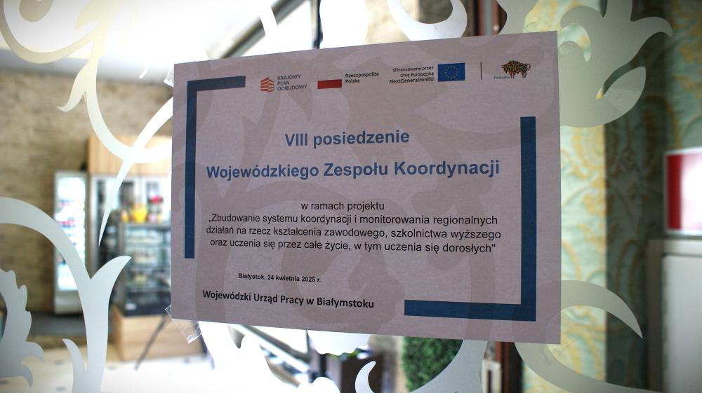 Umieszczony na szklanych drzwiach plakat informujący o posiedzeniu Wojewódzkiego Zespołu Koordynacji