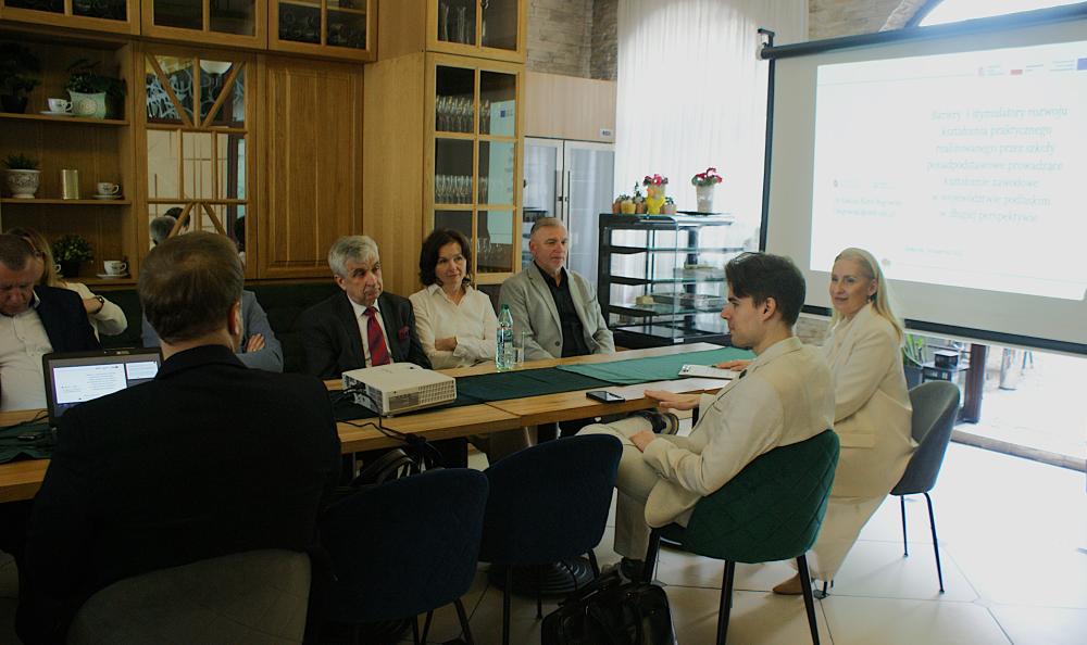 W drugiej części spotkania uczestnicy mogli zapoznać się z wynikami opracowania pt. „Bariery i stymulatory rozwoju kształcenia praktycznego realizowanego przez szkoły ponadpodstawowe prowadzące kształcenie zawodowe w województwie podlaskim w długiej perspektywie”. Wyniki badania, a także wypływające z niego wnioski oraz rekomendacje przedstawił dr Łukasz Bugowski z Uniwersytetu w Białymstoku. Niedopasowanie tempa zmian kształcenia praktycznego do tempa zmian w życiu społeczno-gospodarczym, w tym rozbieżność czasowa między potrzebami rynku pracy i przemysłu a możliwością wykształcenia osób o wymaganych kwalifikacjach, wysoki stopień zbiurokratyzowania procesu wprowadzania zmian w systemie kształcenia praktycznego; niskie zainteresowanie pracodawców współpracą ze szkołami ponadpodstawowymi prowadzącymi kształcenie praktyczne; niski poziom świadomości ludzi młodych (uczniów) i rodziców w zakresie zawodów przyszłości; podejmowanie błędnych decyzji edukacyjnych i doboru odpowiedniego zawodu to tylko część z wniosków z przeprowadzonego badania. Z całością opracowania będzie można zapoznać się na naszej stronie internetowej już wkrótce.